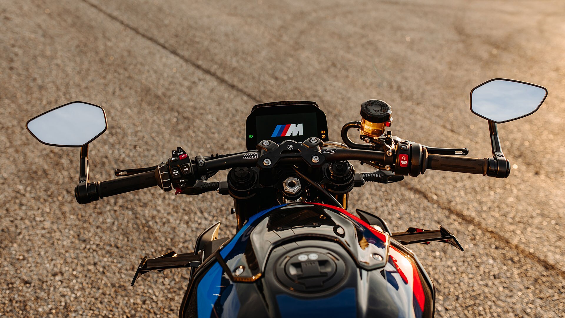 Dominante Front, aggressives Heck: Die M R ist in Bestform. Du nimmst Platz auf dem M Sitz in perfekter Höhe und greifst nach dem verbreiterten Rohrlenker mit gelasertem „BMW M 1000 R“-Schriftzug. Dein Blick fällt in die aus Aluminium gefrästen Lenkerendspiegel. Sound an, Licht an: Das M Logo zeigt sich im LED-Scheinwerfer. Du weißt: Die Straße gehört Dir.